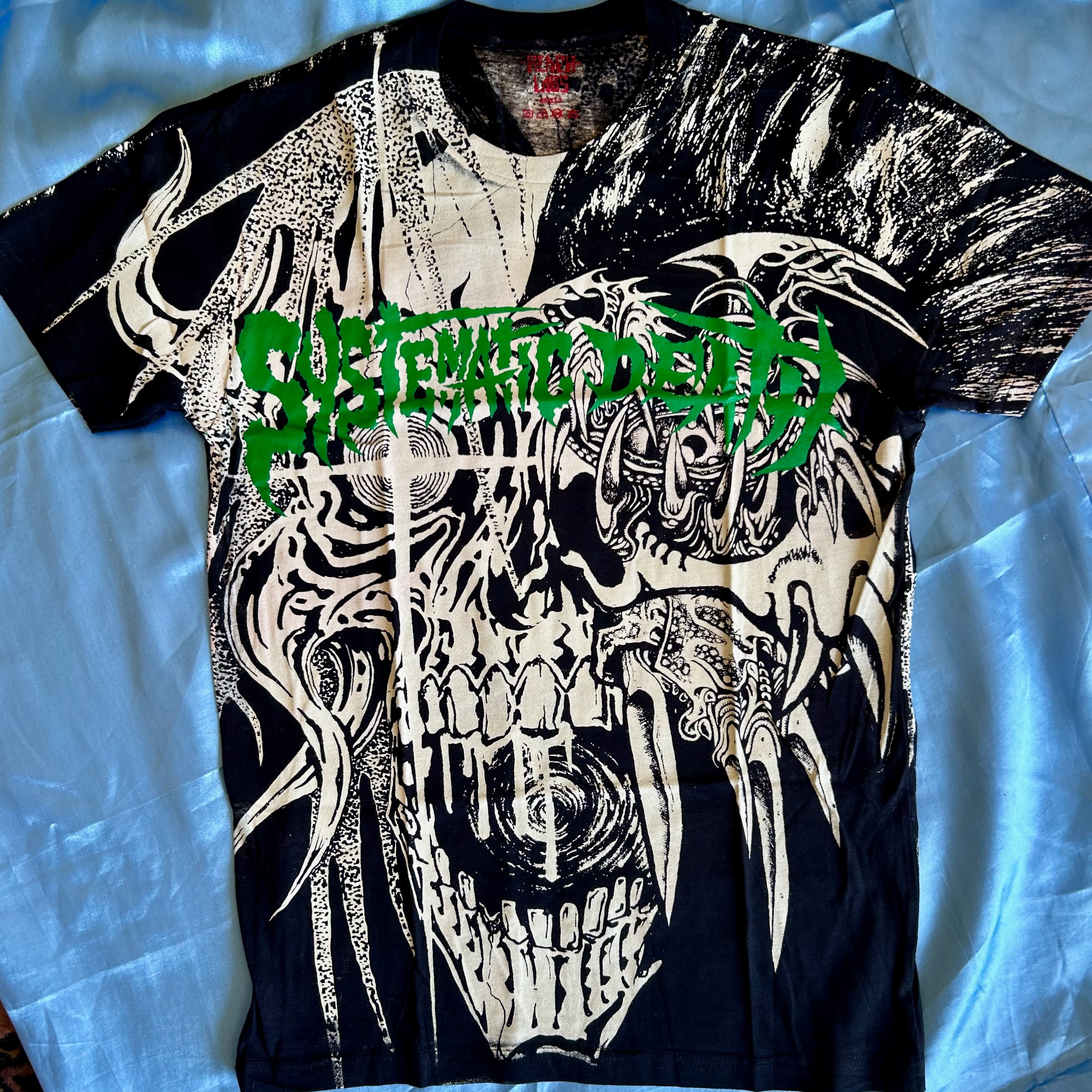 巨大なシルクスクリーン版を作り、白く見える部分はインクではなく抜染で表裏面を脱色(裏に染みない様相当気を遣ったものと思われる)、その上で表裏のバンドロゴをプリント。